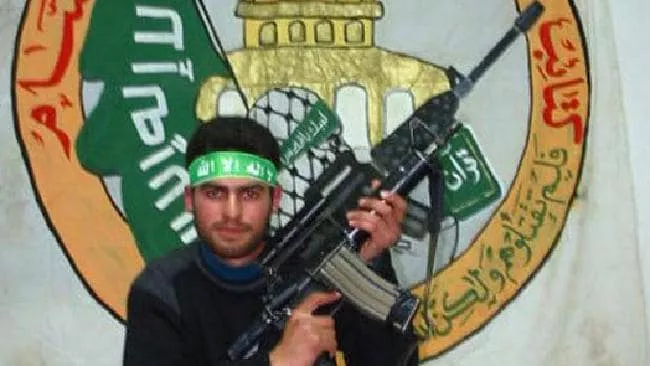 Wearing a Hamas headband, Fadi holds an M4 assault rifle in front of the Ezzedeen Al Qassam Brigades banner that pictures the Al Aqsa mosque in the background.